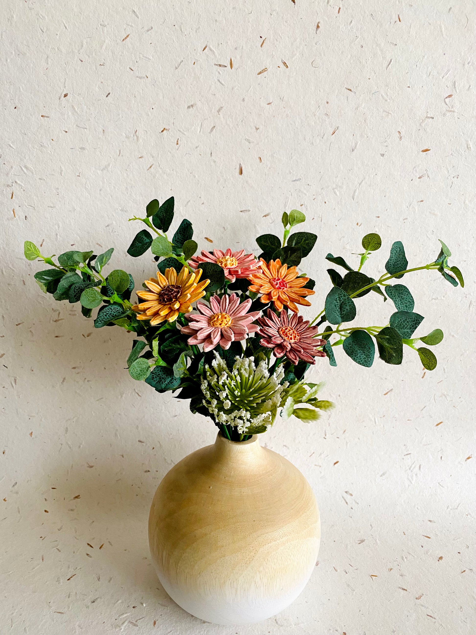This centre piece features five beautifully detailed double daisies, nestled in lush foliage and encased in a decorative mango wood vase. Perfect for adding a touch of natural beauty to any room.