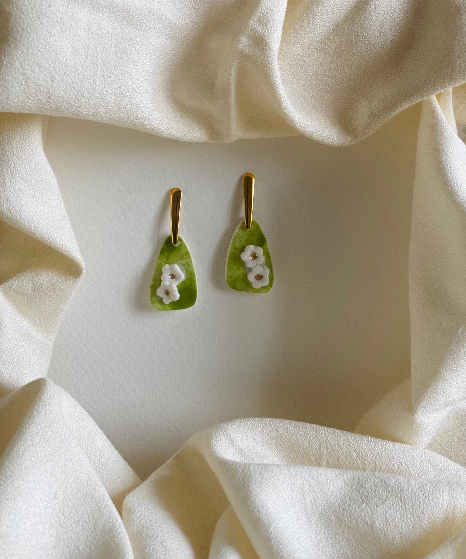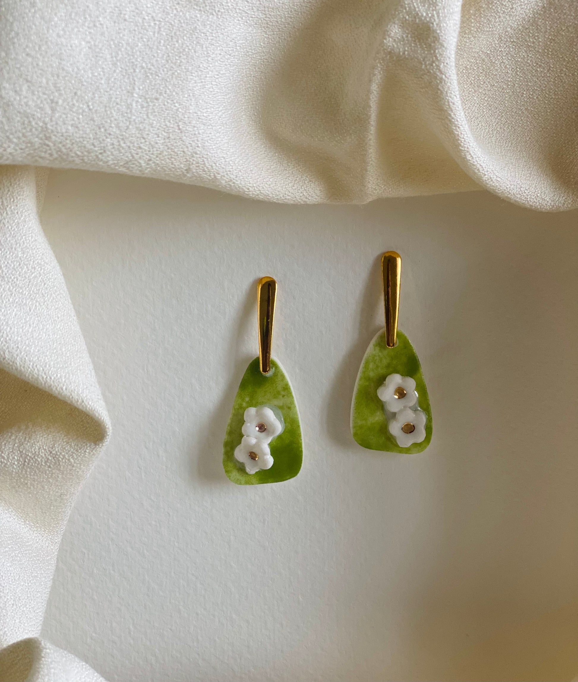 Expertly crafted with porcelain and adorned with 22k gold accents, these earrings are a stunning combination of elegance and color. Add a touch of sophistication to any outfit with these unique and eye-catching earrings.